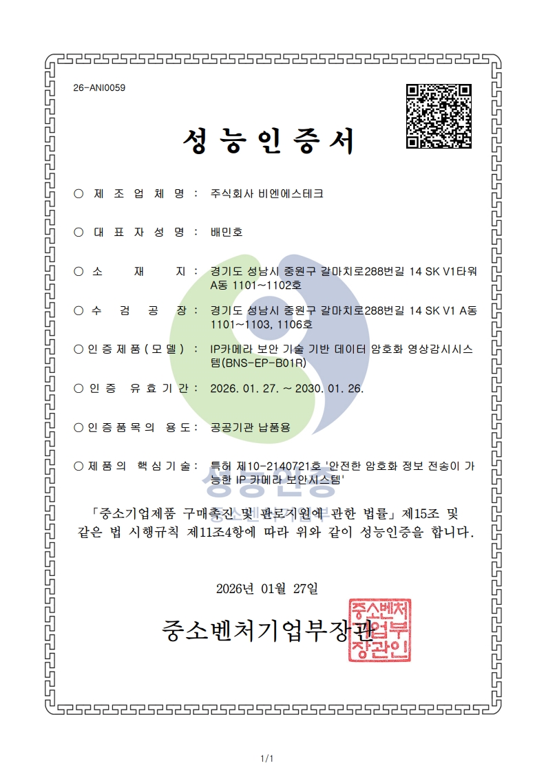 소프트웨어품질인증서 1등급 (데이터 암호화 영상감시시스템 v3.0)
