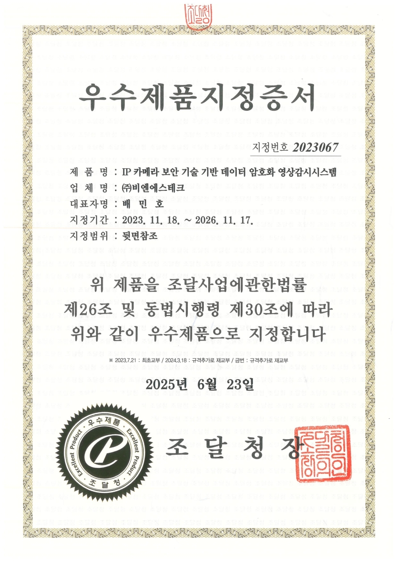 우수제품지정증서