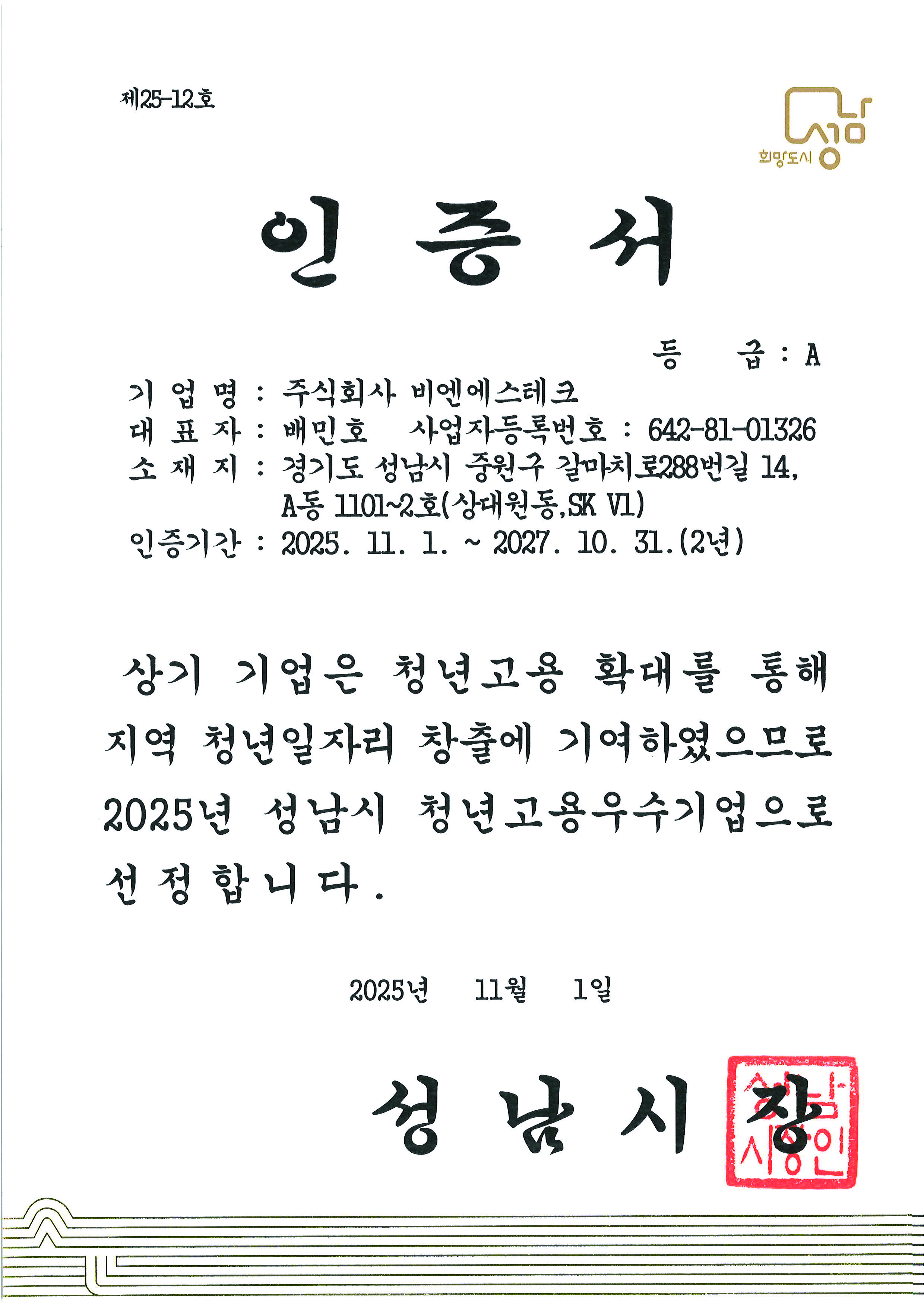 청년 고용 우수기업 인증서