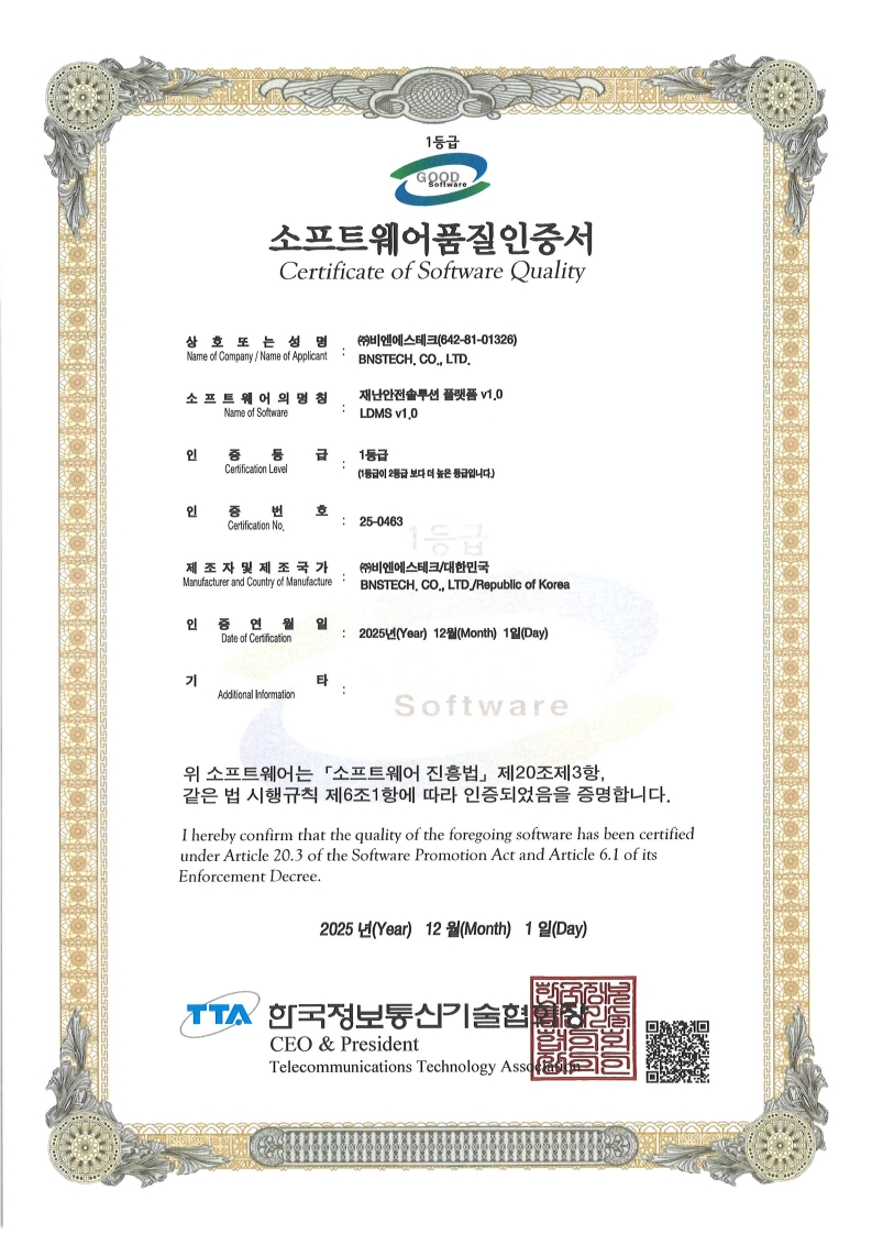 소프트웨어품질인증서 1등급 (재난안전솔루션 플랫폼 LDMS v1.0)